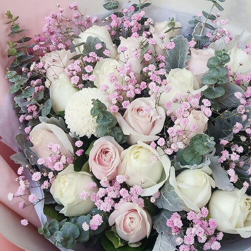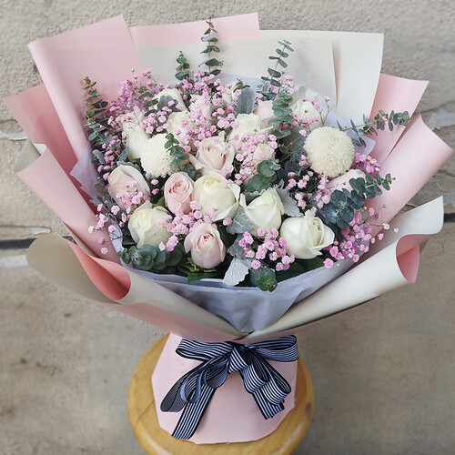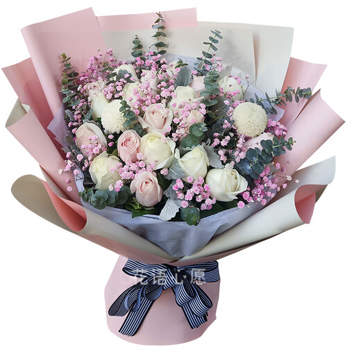 细选粉色与白色玫瑰混搭,尽显甜美风范,可以带给爱人惊喜;做工较为精致,包装造型优雅,有效增加了花束的美感。