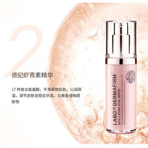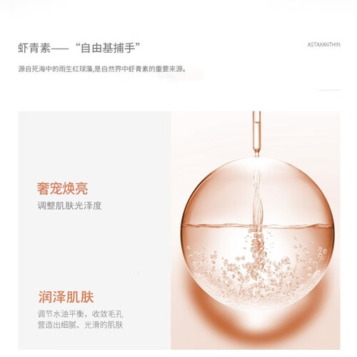 以虾青素为主要成分,能够给肌肤持久的水分滋养,同时舒缓肌肤,淡化细纹,均匀提升肌肤光泽度,让肌肤更有活力。