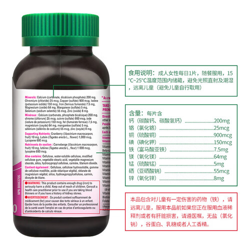 专为女性专研营养配方,富含13种维生素、9种矿物质和胡萝卜素等营养成分。小颗粒,服用易吞服。