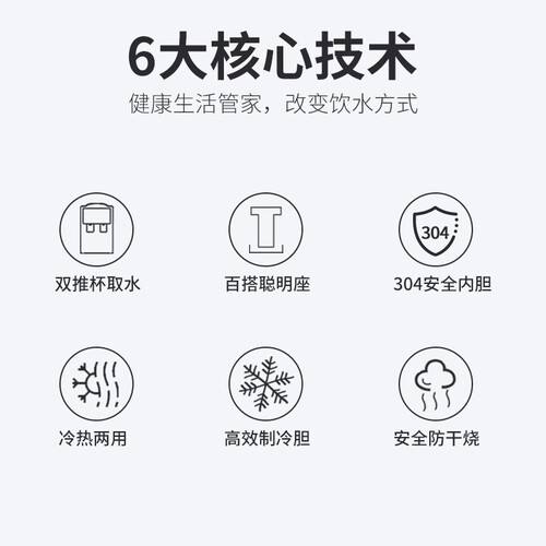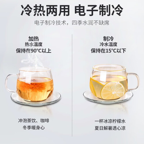 双推杯式取水设计,单手轻松操作,快捷又方便。运用电子制冷技术,热水保持90°C以上,冷水保持15°C以下,冷热两用。