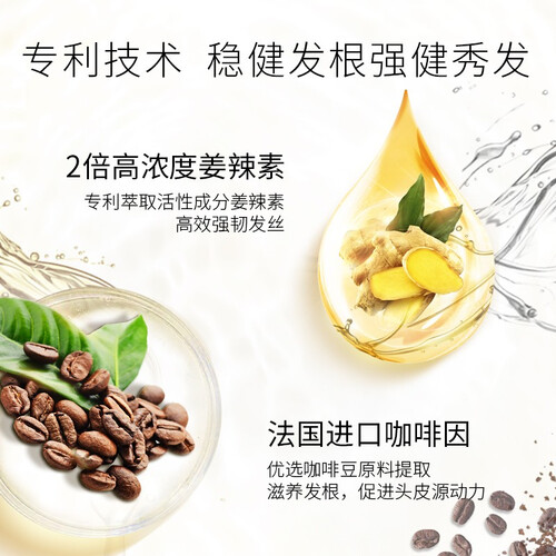 使用微冷萃技术,有效提升生姜提取物的浓度,让生姜更好的活性能够更好保持。特别添加三重咖啡因分子,焕发头皮活力强韧发根。