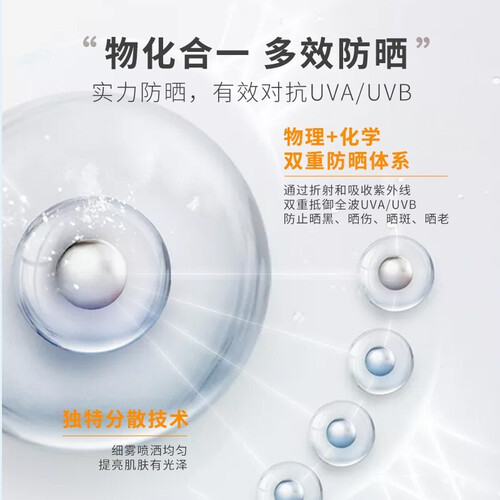 具有12小时防晒力的防晒喷雾,将独特分散技术与物理、化学双重防晒体系糅合,可均匀喷洒在裸漏在外的肌肤上进行全波段防晒。