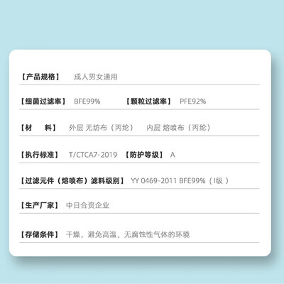 此款采用熔喷布,可有效过滤细小颗粒,避免吸入有害颗粒;无纺布设计,透气清爽,且呼吸顺畅,让你享受洁净空气。