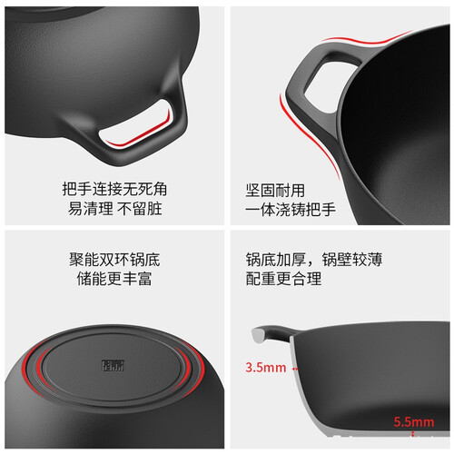 加厚锅底设计,不仅控温好还能够增加容量,搭配圆角锅壁,方便下铲烹饪的同时,不易藏污纳垢。