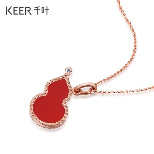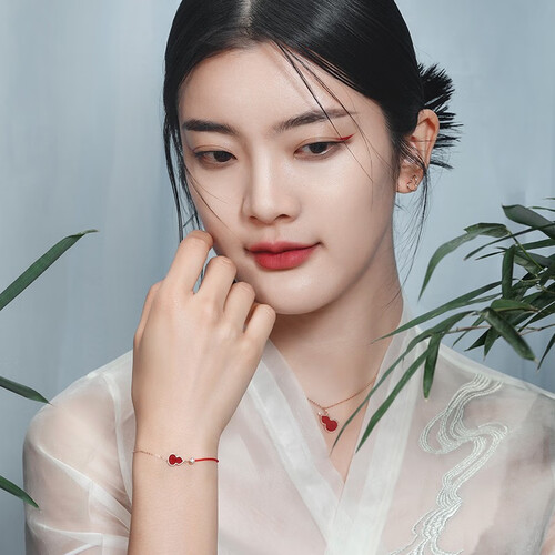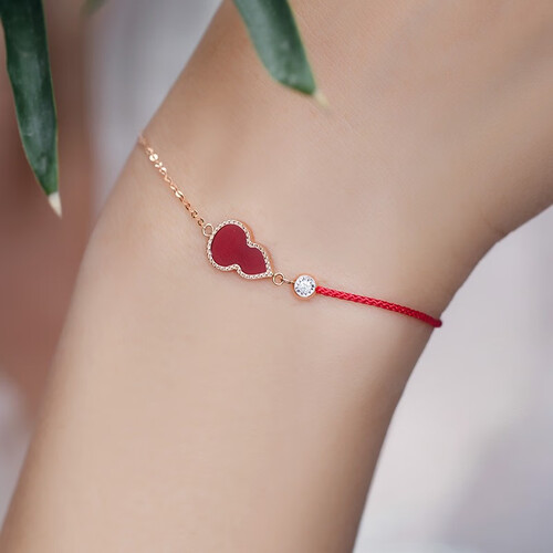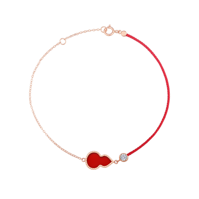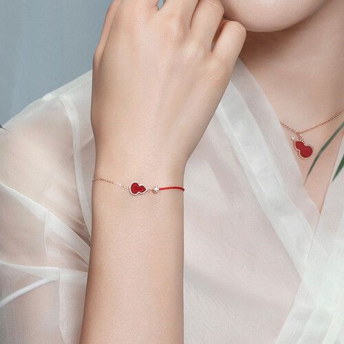 红色玛瑙镶嵌于金葫芦中,款式设计时尚显新颖,呈现中式的喜庆之感,打造环绕腕间的色彩韵律;顶部点缀一颗砖石,极具东方韵味。