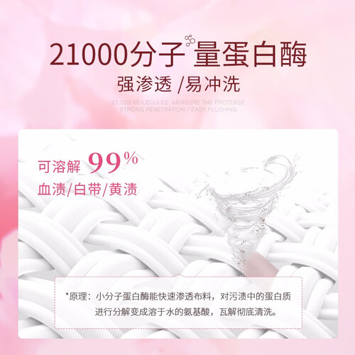 富含小分子蛋白酶,快速渗透,分解污渍,溶解血渍,洁净透亮。蕴含月见草油,质地爽洁舒适,避免肌肤不适感。