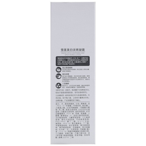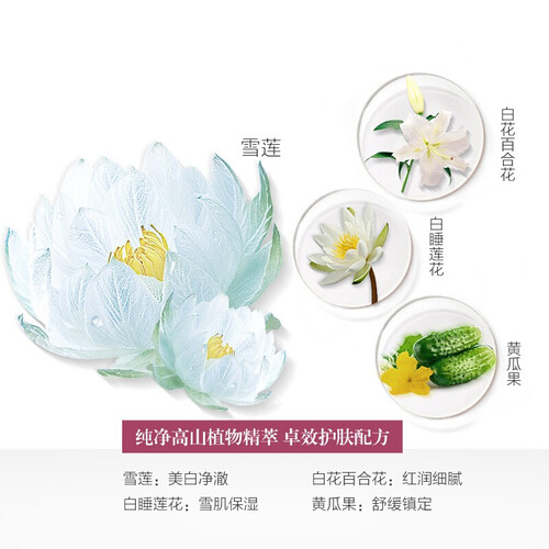 源自高山植物的雪莲,经过高科技的精粹技术,缔造水润雪肌。质地水感清爽,轻拍易吸收,滋润亮白肌肤。