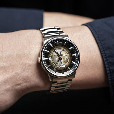搭载caliber80机芯,带来充足的动能储备,续航时间持久;粗壮的棒形针设计,结合上半透的表盘,衬托出型男的阳刚气质。