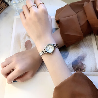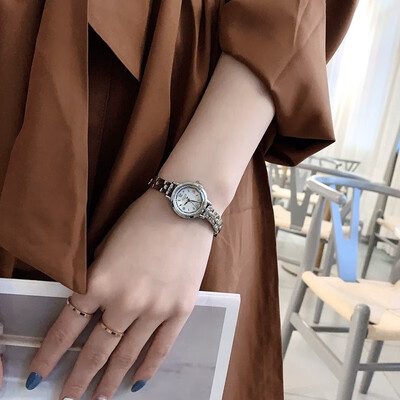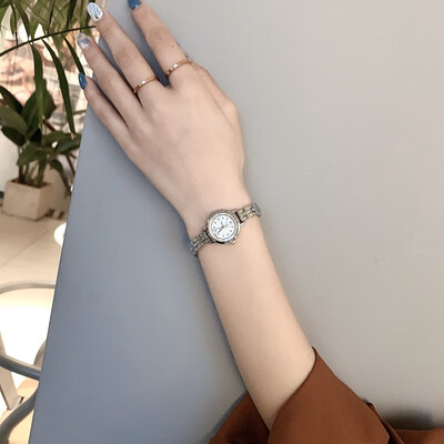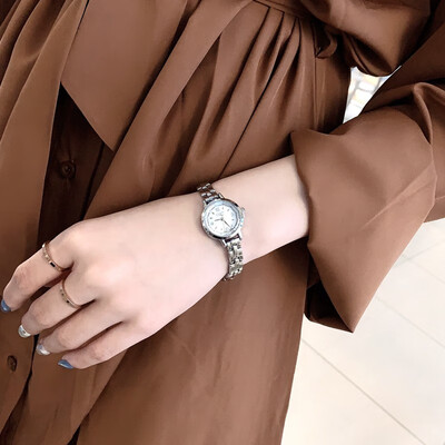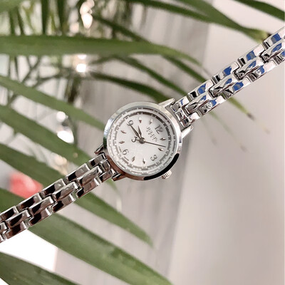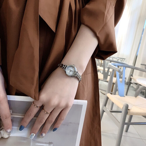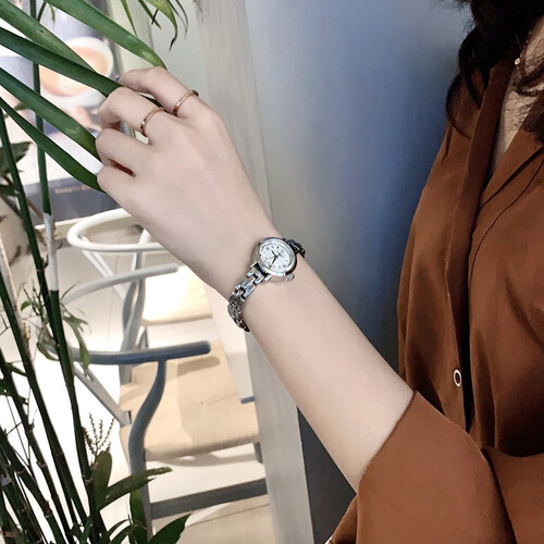 一款很显气质的白底小银女士手表,表盘体积较小,戴着更显小巧;白银配色经典大方,复古风格十分明显。