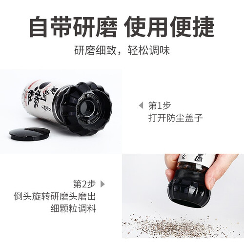 产区直供原料,保证每一颗胡椒粒纯粹的天然口感,为您的健康饮食保驾护航。防尘瓶盖+自带研磨芯,方便简单,随用随取。