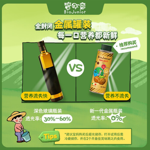 传统物理冷榨工艺成就更出色的核桃油,α-亚麻酸含量高达55%,更适合宝宝娇嫩的肠胃。金属罐装设计,更好的保留营养物质。