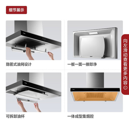 采用环吸云板设计,四周进风,提升了负压面积,实现超大拢烟,即时双灶同时使用,油烟也难逃逸。降噪风道设计,安静烹饪不受扰。