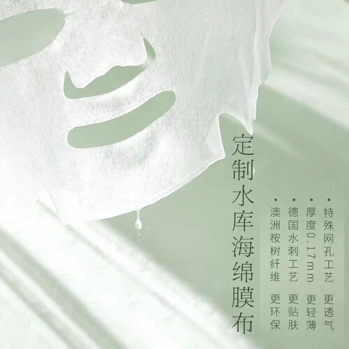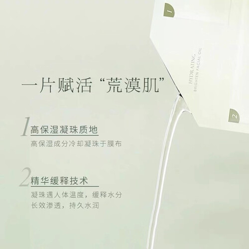 100%天然植物油,质地轻盈,触肤即融。高保湿成分冷却凝珠于膜布,快速润泽肌肤,长效渗透,持久水润。