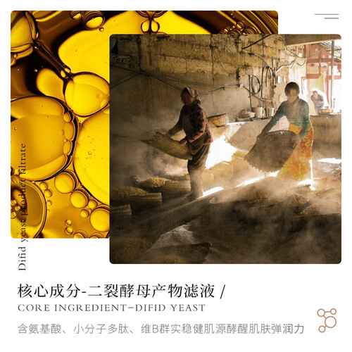 二裂酵母、烟酰胺等核心成分,温柔呵护肌肤。肌肽赋予养分,匀净肌肤,焕亮光泽,缓解肌肤干纹现象。
