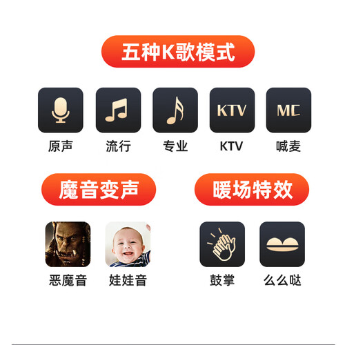 采用双通道发声设计,具有强劲的音效,让你仿佛置身在KTV。同时还有智能美音功能,让你在直播间就能唱出演唱会感觉。