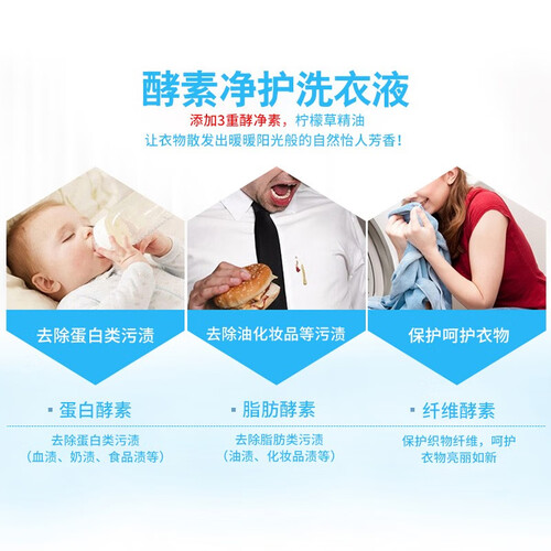 蕴含植物发酵提炼酵素,能去除奶渍、油渍等多种污渍,助衣物亮丽如新。且柠檬草精油成分,让衣物散发怡人清香,沁人心脾。
