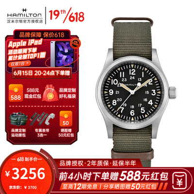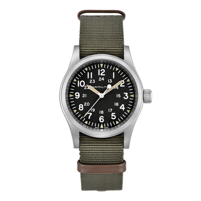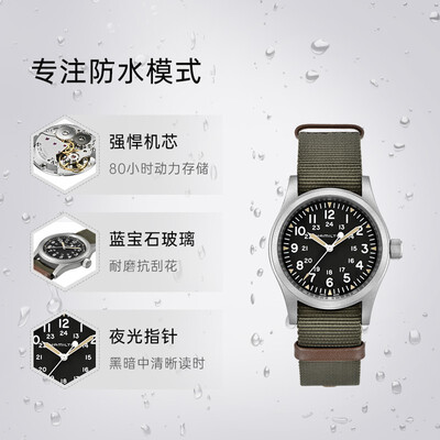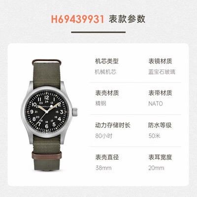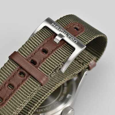 这款汉米尔顿手表,采用阿拉伯数字刻度设计,直观清晰。军绿色配色,具有强烈的军事风格。细腻的军用尼龙表带,灵活柔软。