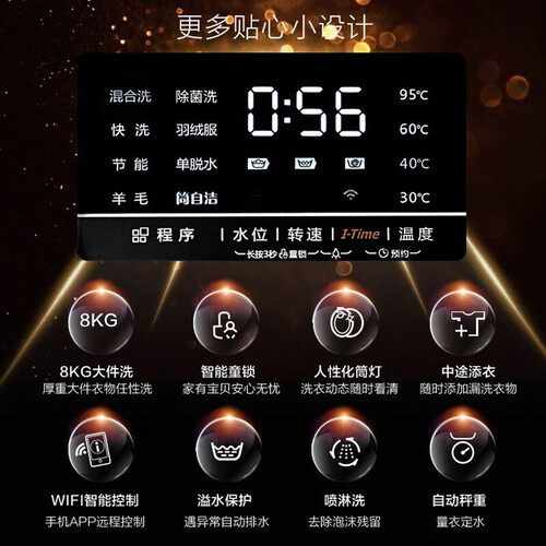 支持智能WIFI互联,摆脱传统看管式洗衣,智能便捷,洗衣状态一目了然。内置LED筒灯,拿取衣物防遗漏,使用更省心。