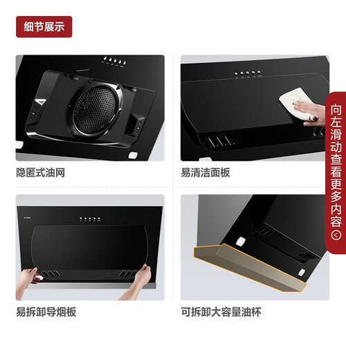 采用优质的黑晶面板,时尚感较强,油烟不易附着,比较容易清理。并采用黑晶面板设计,美观更具质感。