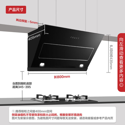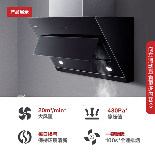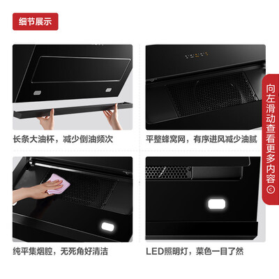 原厂电机带来澎湃动力,将大风量瞬间释放,快速静烟。机身整体角度科学设计,保障油烟多角度聚拢,吸烟效率更高。