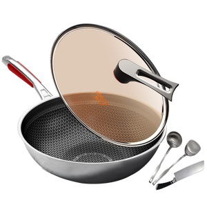 炒锅底部搭载蜂窝状交织凸点,不畏惧钢铲剐蹭,不易留有划痕。锅身采用多层德式复合工艺,导热速度快,油烟产生少。