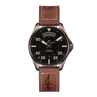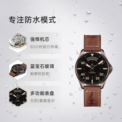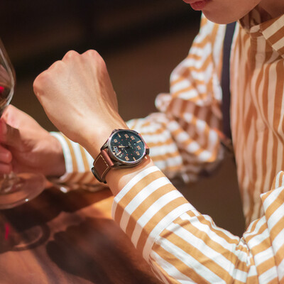 深邃典雅的黑色盘面,体现出炫酷的时尚主题,咖色的真皮表带,融入了空军的翼型压花元素,更加体现俊朗。