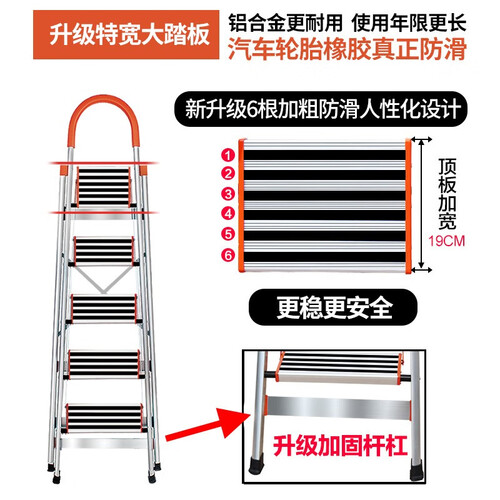 踏板上采用加厚轮胎橡胶防滑条,自由上下不易踏空,安全又放心。加厚铝合金框架,放心承重不摇晃。