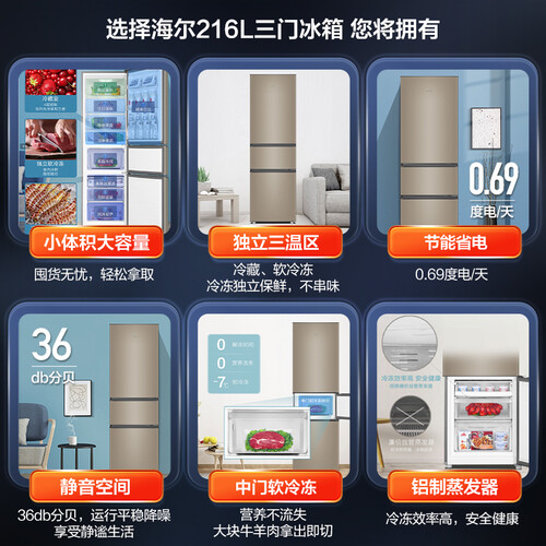 采用三门三温独立藏鲜,满足多种食材的储藏需求,无需担心串味。内置216L大容量设计,再多的食材都能装得下,减少购物次数。