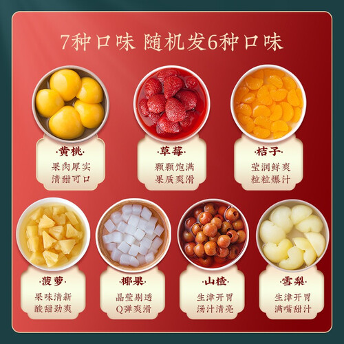 礼盒包含多种不同口味的水果罐头,大块儿的果肉让味蕾得到满足。不添加防腐剂,开袋即可食用,简单方便。