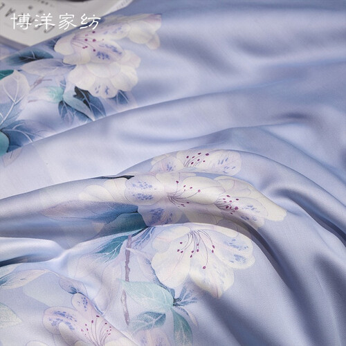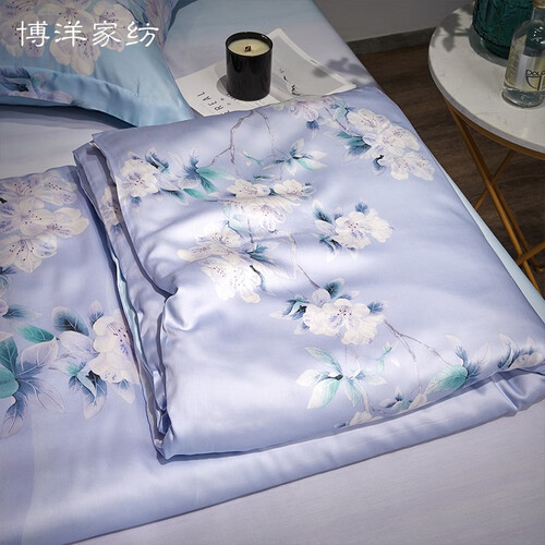 采用清新的淡蓝色和浪漫的淡紫色呈现,营造温馨的居室氛围。精选优质双面天丝面料,触感柔软亲肤。环保印花工艺,色泽明亮艳丽。