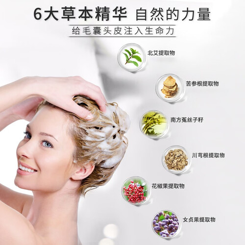 苦参根、北艾、菟丝子籽等6大草本精华,给毛囊头皮注入生命力。山奈、生姜清洁控油,提升头发韧性,减轻头发脱落。