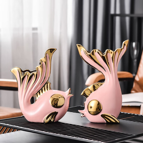 一对粉红色的亲嘴鱼陶瓷花瓶,插入玫瑰花苞,散发浪漫甜美气息,适合好友结婚、开业送礼等场景。