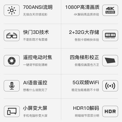 采用快门3D技术带来震撼观影体验,四角梯形校正使侧投也方正,支持5G双频WiFi数据传输更稳定,大容量内存运行更流畅。