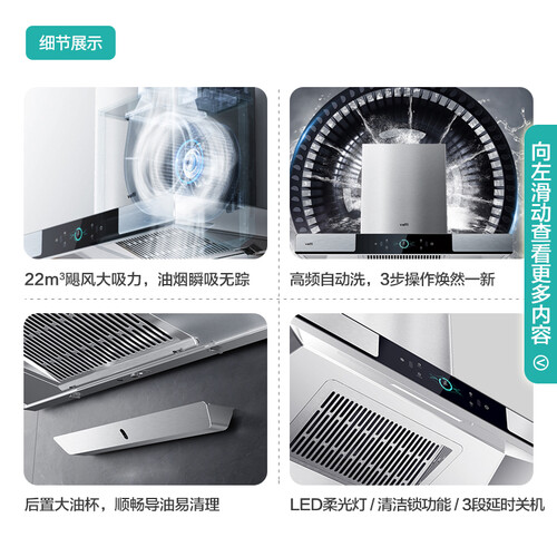 具备隐藏的LED照明灯,提供充足的光照条件,黑天做饭不担心烫手。甄选黑晶钢化玻璃面板,一抹即净家务很轻松。