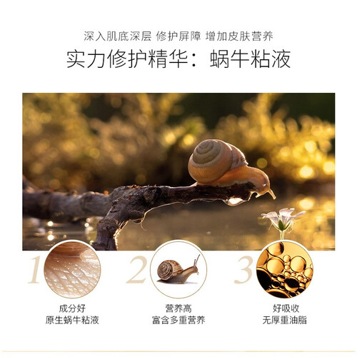 蕴含蜗牛粘液提取物,滋润养肤肌肤细腻丝滑有弹性,恢复年轻活力。牛油果脂成分,深度滋养肌肤,加强肌肤保湿性。