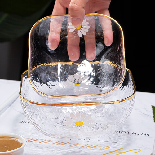 碗身加入小雏菊花纹,为清澈透亮的造型增添一丝清新可爱感,简约又别致;采用无铅玻璃制作,仔细把控生产流程,不含重金属。