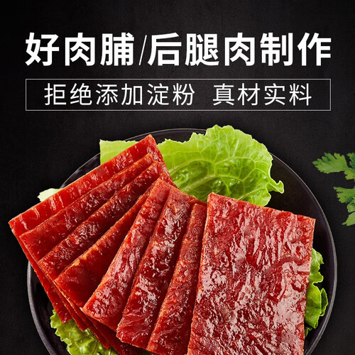 选取真材实料猪后腿瘦肉,不添加淀粉,经过循环烘烤烤制出薄厚适宜的肉脯,口感紧实,韧而不柴。