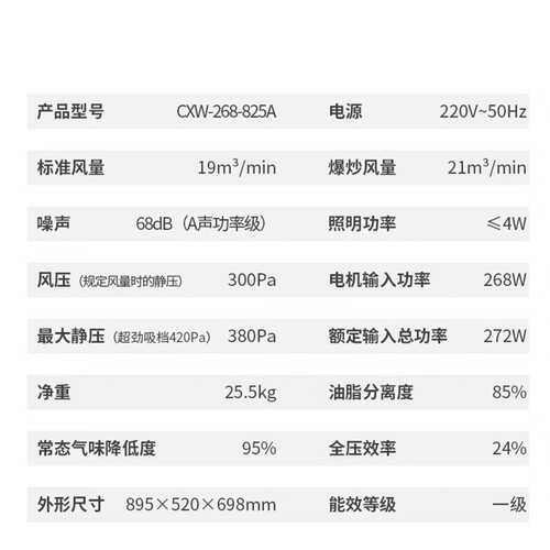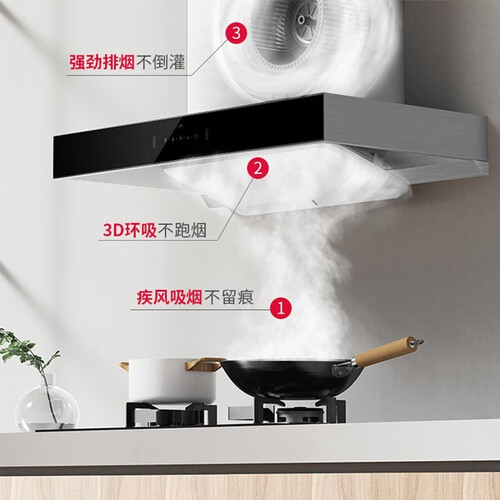 一体式增压风道系统,防止有倒灌的现象出现,排烟更快捷。3D环吸,不会有跑烟的情况发生,能够多方位进行笼罩油烟。