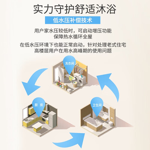 安装恒温智控系统,保障全屋热水稳定,洗澡淋浴不怕忽冷忽热。采用低水压补偿技术,水压较低时一键启动增压功能,保障全屋用水。