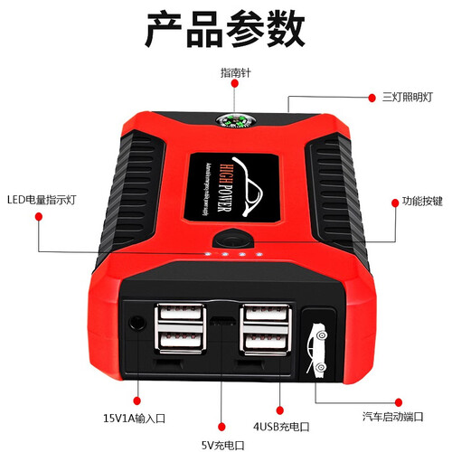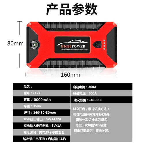 内置10000毫安电池,可实现快速启动,为出行提供便利。设有多种电流输出口,能为多个车载设备供电。