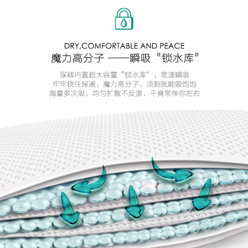 精选高品质阳光棉织成亲肤表层,透气又舒适;高魔力分子,高速瞬吸,让屁屁持续干爽。