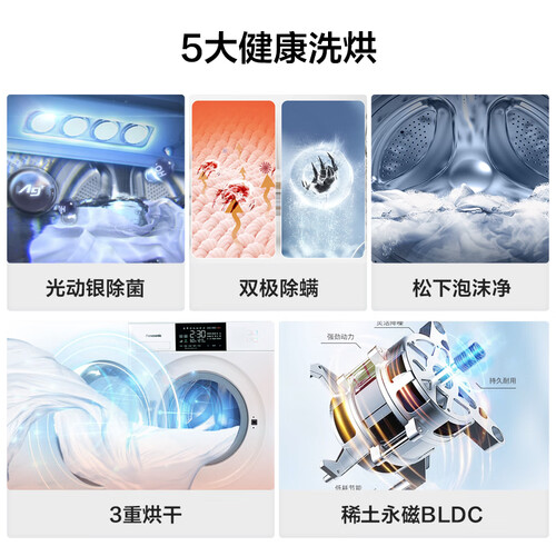 使用BLDC变频电机,静音运行,不给你安静的生活增加噪音。搭载10kg大洗烘容量,大件衣物轻松洗,便利生活。