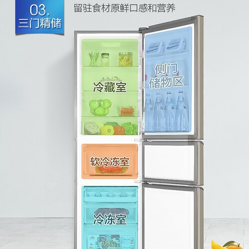 这款冰箱采用三门三温区设计,食物分区储藏,保鲜不易串味。低温补偿设计,多种场景都可使用。且运行时噪音低,不打扰日常生活。