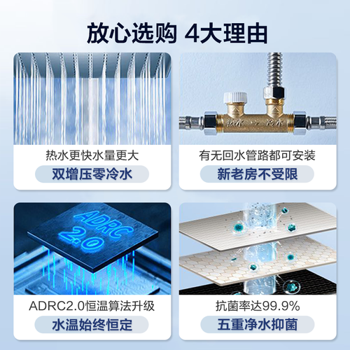 多重净化技术,阻隔铁锈泥沙,确保健康沐浴。搭配智能10倍,热水量200L,全家轻松接力沐浴。
