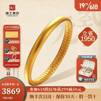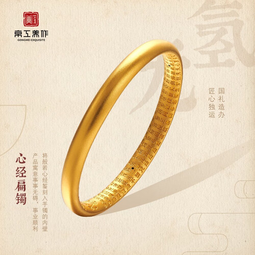 设计灵感“般诺心经”寓意保佑事事无碍,故主事业顺利。哑光质感还原黄金本色,纹理平整均匀,传统古法工艺錾刻,传承经典。