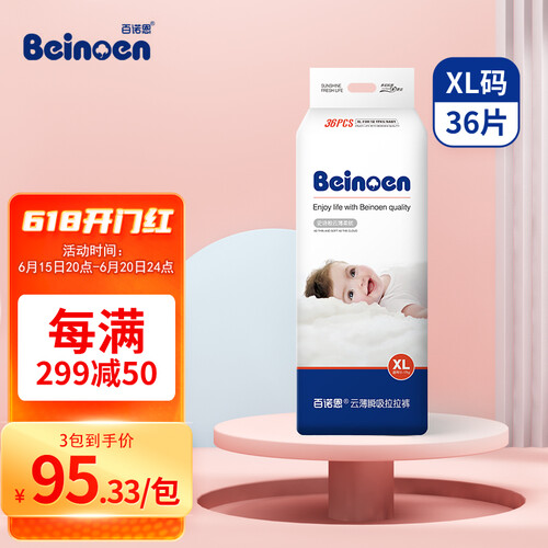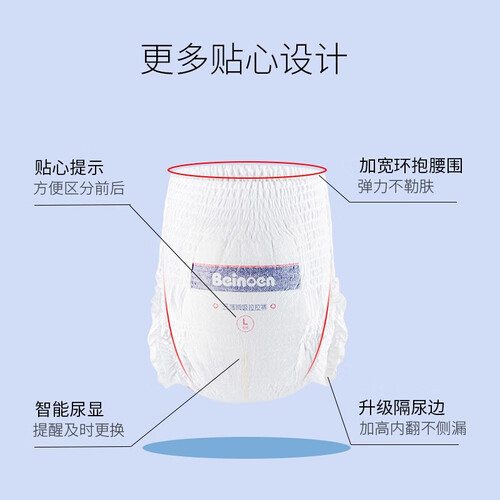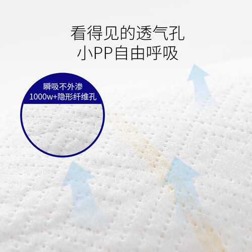 采用瞬吸技术的设计,快速吸干尿液,保持屁屁舒爽。添加锁水颗粒,加强纸尿裤的防漏性,安全不易漏,让宝宝放心玩耍。