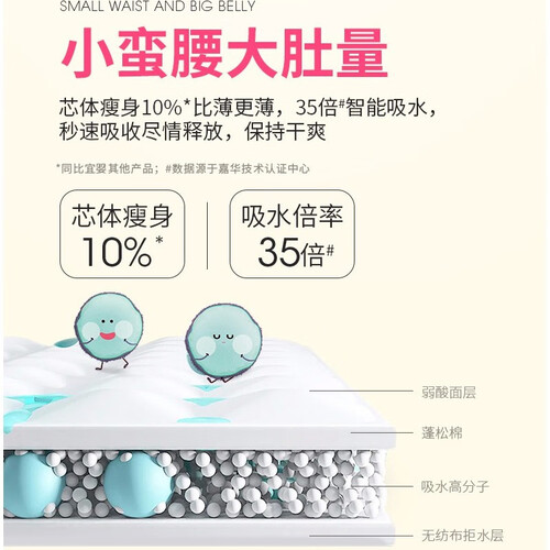 表层采用了弱酸性的配方,减少尿液对于皮肤的刺激感。3D葡萄状面层,让尿液快速排出,轻薄的芯体,保证吸收量。