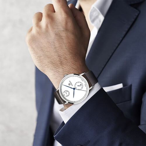 不锈钢表带经过多项工序处理,佩戴舒适而又光滑。蓝色的指针,打破了整体的单调感,为整体注入活力。