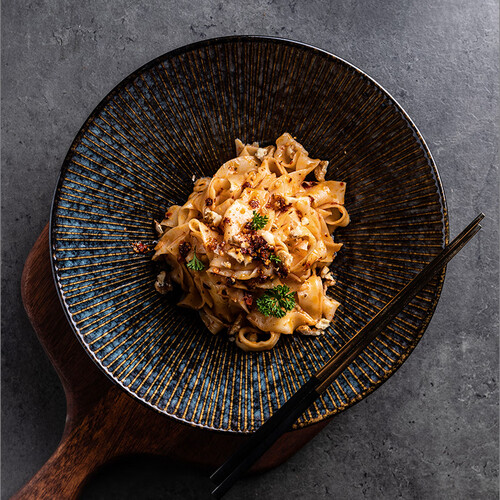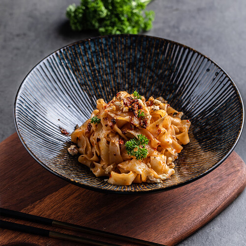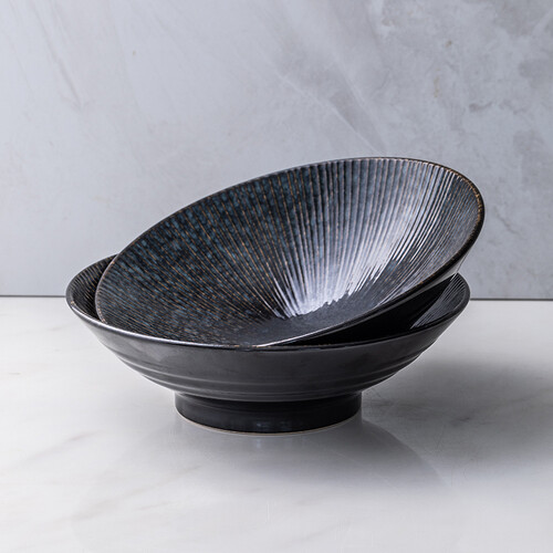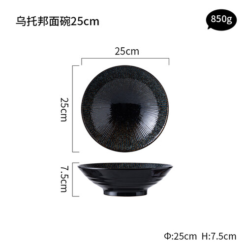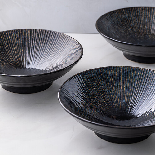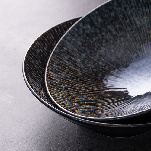 碗具呈现为斗笠造型,能盛装更多美食,满足丰富的饮食需求。灰黑色釉面设计,搭配暗金色浮雕,碰撞出深邃独特的美学效果。