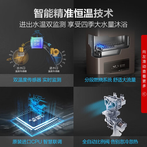 创新微火燃烧技术,小火低排量,更小功率不费电,节能减排夏日也可用。具有PID自适应加热调节,全屋热水自动匹配出水量。